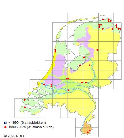 Het aantal atlasblokken (5x5 km) waarin de soort is gemeld binnen een periode van vijf jaar (vanaf 1980) of twintig jaar. Niet gecorrigeerd voor waarnemersinspanning en het aantal doorgegeven waarnemingen kan sterk variëren per periode, dus een trend in verspreiding kan hier niet direct uit worden afgelezen. Het opgegeven jaartal is het eerste jaar van de periode. Bron: gevalideerde waarnemingen uit de NDFF.