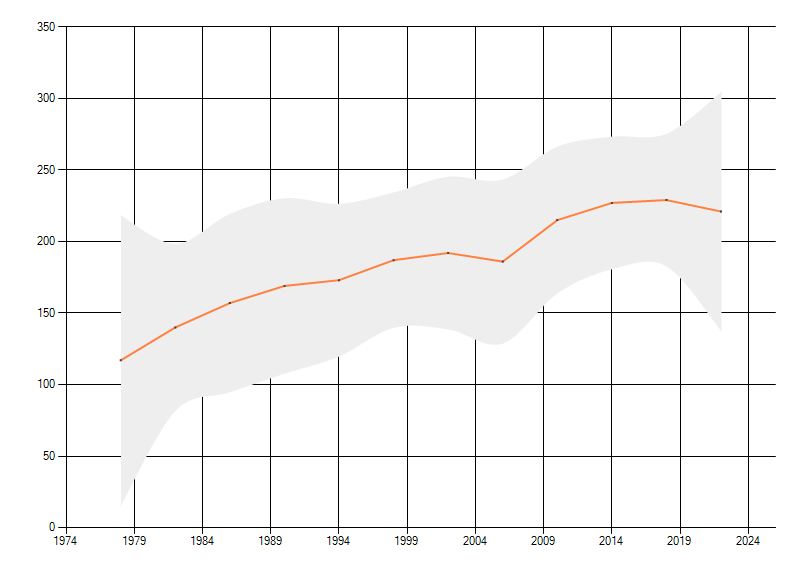 Gemiddelde trend van het aantal kilometerhokken waarin de soort voorkomt, weergegeven als indexcijfer (1975-1978 = 100).