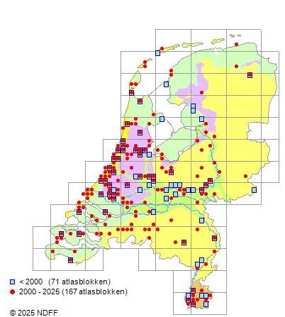 CC BY-NC-SA 3.0 NLVerspreidingNederlandZeldzaam in stedelijke gebieden. Het meest in het westen. Zeer zeldzaam in Zuid-Limburg.