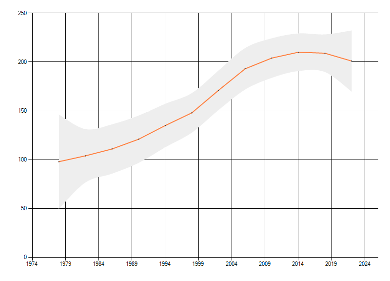 Gemiddelde trend van het aantal kilometerhokken waarin de soort voorkomt, weergegeven als indexcijfer (1975-1978 = 100).