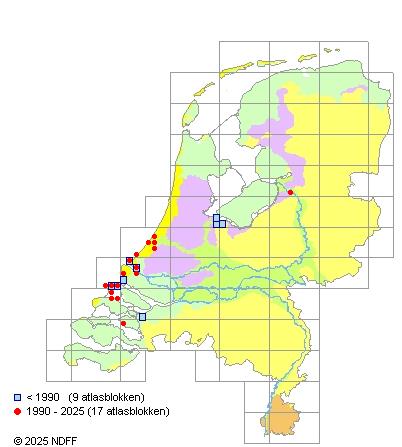 Het aantal atlasblokken (5x5 km) waarin de soort is gemeld binnen een periode van vijf jaar (vanaf 1980) of twintig jaar. Niet gecorrigeerd voor waarnemersinspanning en het aantal doorgegeven waarnemingen kan sterk variëren per periode, dus een trend in verspreiding kan hier niet direct uit worden afgelezen. Het opgegeven jaartal is het eerste jaar van de periode. Bron: gevalideerde waarnemingen uit de NDFF.
