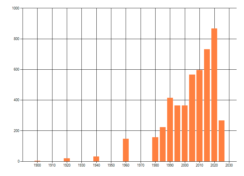 Het aantal atlasblokken (5x5 km) waarin de soort is gemeld binnen een periode van vijf jaar (vanaf 1980) of twintig jaar. Niet gecorrigeerd voor waarnemersinspanning en het aantal doorgegeven waarnemingen kan sterk variëren per periode, dus een trend in verspreiding kan hier niet direct uit worden afgelezen. Het opgegeven jaartal is het eerste jaar van de periode. Bron: gevalideerde waarnemingen uit de NDFF.