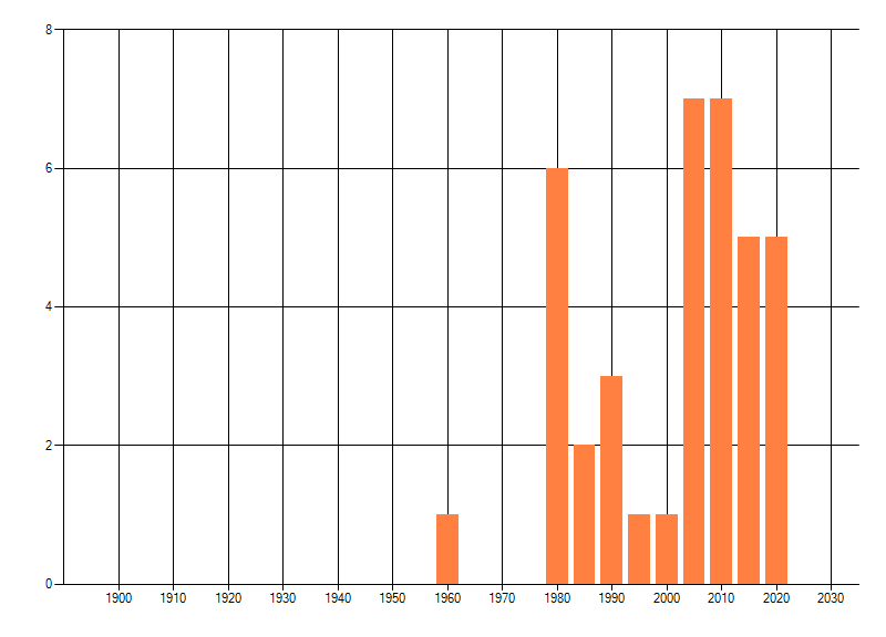 Het aantal atlasblokken (5x5 km) waarin de soort is gemeld binnen een periode van vijf jaar (vanaf 1980) of twintig jaar. Niet gecorrigeerd voor waarnemersinspanning en het aantal doorgegeven waarnemingen kan sterk variëren per periode, dus een trend in verspreiding kan hier niet direct uit worden afgelezen. Het opgegeven jaartal is het eerste jaar van de periode. Bron: gevalideerde waarnemingen uit de NDFF.