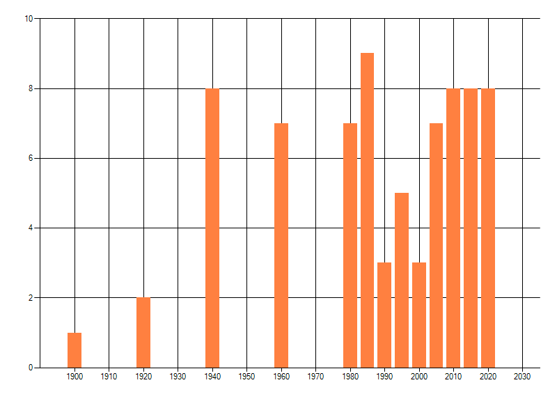 Het aantal atlasblokken (5x5 km) waarin de soort is gemeld binnen een periode van vijf jaar (vanaf 1980) of twintig jaar. Niet gecorrigeerd voor waarnemersinspanning en het aantal doorgegeven waarnemingen kan sterk variëren per periode, dus een trend in verspreiding kan hier niet direct uit worden afgelezen. Het opgegeven jaartal is het eerste jaar van de periode. Bron: gevalideerde waarnemingen uit de NDFF.