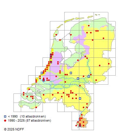 Het aantal atlasblokken (5x5 km) waarin de soort is gemeld binnen een periode van vijf jaar (vanaf 1980) of twintig jaar. Niet gecorrigeerd voor waarnemersinspanning en het aantal doorgegeven waarnemingen kan sterk variëren per periode, dus een trend in verspreiding kan hier niet direct uit worden afgelezen. Het opgegeven jaartal is het eerste jaar van de periode. Bron: gevalideerde waarnemingen uit de NDFF.
