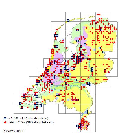 Het aantal atlasblokken (5x5 km) waarin de soort is gemeld binnen een periode van vijf jaar (vanaf 1980) of twintig jaar. Niet gecorrigeerd voor waarnemersinspanning en het aantal doorgegeven waarnemingen kan sterk variëren per periode, dus een trend in verspreiding kan hier niet direct uit worden afgelezen. Het opgegeven jaartal is het eerste jaar van de periode. Bron: gevalideerde waarnemingen uit de NDFF.