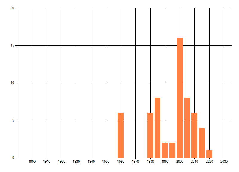 Het aantal atlasblokken (5x5 km) waarin de soort is gemeld binnen een periode van vijf jaar (vanaf 1980) of twintig jaar. Niet gecorrigeerd voor waarnemersinspanning en het aantal doorgegeven waarnemingen kan sterk variëren per periode, dus een trend in verspreiding kan hier niet direct uit worden afgelezen. Het opgegeven jaartal is het eerste jaar van de periode. Bron: gevalideerde waarnemingen uit de NDFF.
