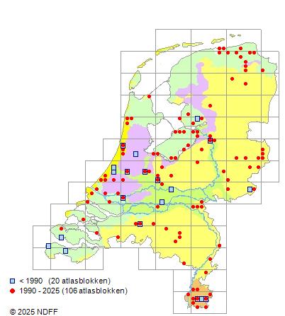 Het aantal atlasblokken (5x5 km) waarin de soort is gemeld binnen een periode van vijf jaar (vanaf 1980) of twintig jaar. Niet gecorrigeerd voor waarnemersinspanning en het aantal doorgegeven waarnemingen kan sterk variëren per periode, dus een trend in verspreiding kan hier niet direct uit worden afgelezen. Het opgegeven jaartal is het eerste jaar van de periode. Bron: gevalideerde waarnemingen uit de NDFF.