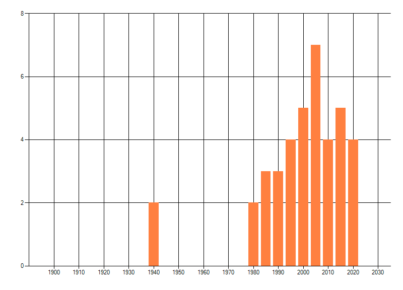 Het aantal atlasblokken (5x5 km) waarin de soort is gemeld binnen een periode van vijf jaar (vanaf 1980) of twintig jaar. Niet gecorrigeerd voor waarnemersinspanning en het aantal doorgegeven waarnemingen kan sterk variëren per periode, dus een trend in verspreiding kan hier niet direct uit worden afgelezen. Het opgegeven jaartal is het eerste jaar van de periode. Bron: gevalideerde waarnemingen uit de NDFF.