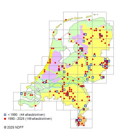 Het aantal atlasblokken (5x5 km) waarin de soort is gemeld binnen een periode van vijf jaar (vanaf 1980) of twintig jaar. Niet gecorrigeerd voor waarnemersinspanning en het aantal doorgegeven waarnemingen kan sterk variëren per periode, dus een trend in verspreiding kan hier niet direct uit worden afgelezen. Het opgegeven jaartal is het eerste jaar van de periode. Bron: gevalideerde waarnemingen uit de NDFF.