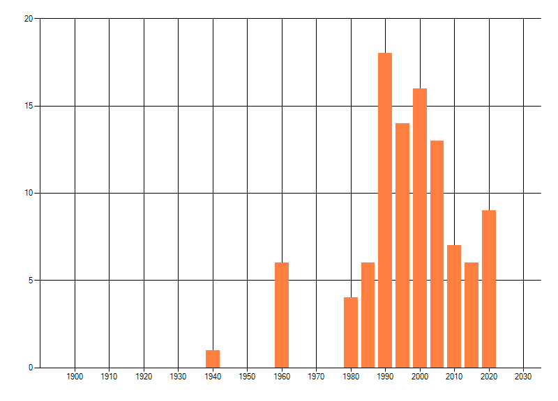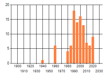 Het aantal atlasblokken (5x5 km) waarin de soort is gemeld binnen een periode van vijf jaar (vanaf 1980) of twintig jaar. Niet gecorrigeerd voor waarnemersinspanning en het aantal doorgegeven waarnemingen kan sterk variëren per periode, dus een trend in verspreiding kan hier niet direct uit worden afgelezen. Het opgegeven jaartal is het eerste jaar van de periode. Bron: gevalideerde waarnemingen uit de NDFF.