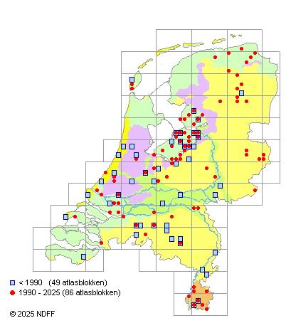 Het aantal atlasblokken (5x5 km) waarin de soort is gemeld binnen een periode van vijf jaar (vanaf 1980) of twintig jaar. Niet gecorrigeerd voor waarnemersinspanning en het aantal doorgegeven waarnemingen kan sterk variëren per periode, dus een trend in verspreiding kan hier niet direct uit worden afgelezen. Het opgegeven jaartal is het eerste jaar van de periode. Bron: gevalideerde waarnemingen uit de NDFF.