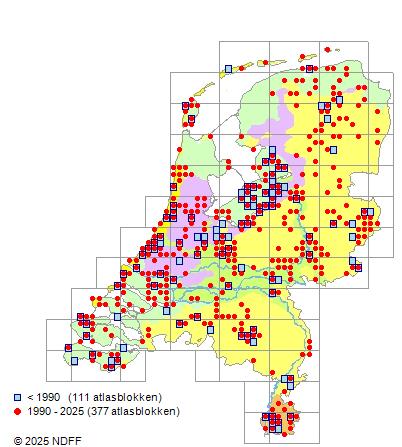 Het aantal atlasblokken (5x5 km) waarin de soort is gemeld binnen een periode van vijf jaar (vanaf 1980) of twintig jaar. Niet gecorrigeerd voor waarnemersinspanning en het aantal doorgegeven waarnemingen kan sterk variëren per periode, dus een trend in verspreiding kan hier niet direct uit worden afgelezen. Het opgegeven jaartal is het eerste jaar van de periode. Bron: gevalideerde waarnemingen uit de NDFF.