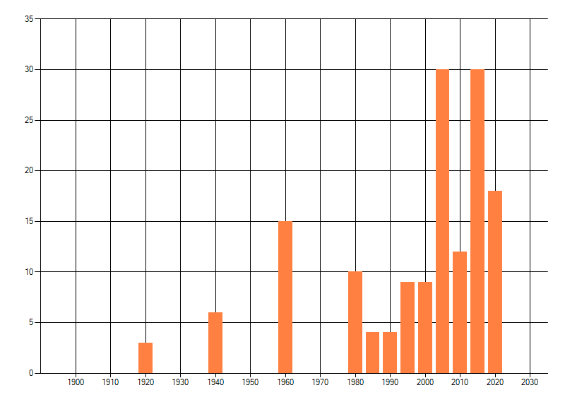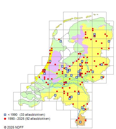 Het aantal atlasblokken (5x5 km) waarin de soort is gemeld binnen een periode van vijf jaar (vanaf 1980) of twintig jaar. Niet gecorrigeerd voor waarnemersinspanning en het aantal doorgegeven waarnemingen kan sterk variëren per periode, dus een trend in verspreiding kan hier niet direct uit worden afgelezen. Het opgegeven jaartal is het eerste jaar van de periode. Bron: gevalideerde waarnemingen uit de NDFF.