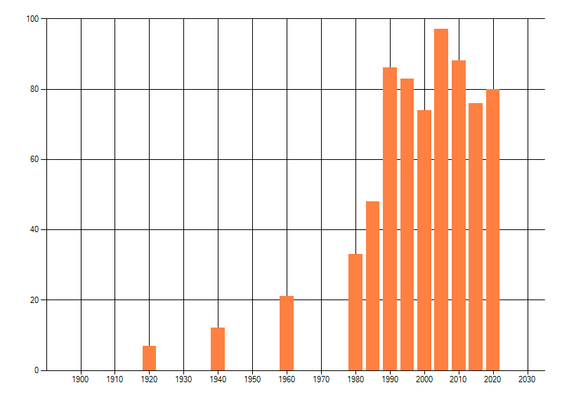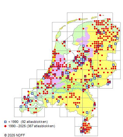 Het aantal atlasblokken (5x5 km) waarin de soort is gemeld binnen een periode van vijf jaar (vanaf 1980) of twintig jaar. Niet gecorrigeerd voor waarnemersinspanning en het aantal doorgegeven waarnemingen kan sterk variëren per periode, dus een trend in verspreiding kan hier niet direct uit worden afgelezen. Het opgegeven jaartal is het eerste jaar van de periode. Bron: gevalideerde waarnemingen uit de NDFF.