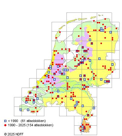 Het aantal atlasblokken (5x5 km) waarin de soort is gemeld binnen een periode van vijf jaar (vanaf 1980) of twintig jaar. Niet gecorrigeerd voor waarnemersinspanning en het aantal doorgegeven waarnemingen kan sterk variëren per periode, dus een trend in verspreiding kan hier niet direct uit worden afgelezen. Het opgegeven jaartal is het eerste jaar van de periode. Bron: gevalideerde waarnemingen uit de NDFF.