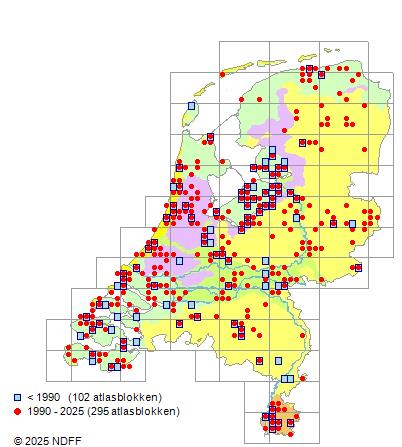 Het aantal atlasblokken (5x5 km) waarin de soort is gemeld binnen een periode van vijf jaar (vanaf 1980) of twintig jaar. Niet gecorrigeerd voor waarnemersinspanning en het aantal doorgegeven waarnemingen kan sterk variëren per periode, dus een trend in verspreiding kan hier niet direct uit worden afgelezen. Het opgegeven jaartal is het eerste jaar van de periode. Bron: gevalideerde waarnemingen uit de NDFF.