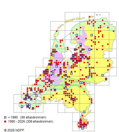 Het aantal atlasblokken (5x5 km) waarin de soort is gemeld binnen een periode van vijf jaar (vanaf 1980) of twintig jaar. Niet gecorrigeerd voor waarnemersinspanning en het aantal doorgegeven waarnemingen kan sterk variëren per periode, dus een trend in verspreiding kan hier niet direct uit worden afgelezen. Het opgegeven jaartal is het eerste jaar van de periode. Bron: gevalideerde waarnemingen uit de NDFF.