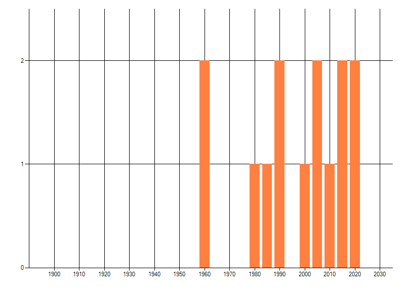 Het aantal atlasblokken (5x5 km) waarin de soort is gemeld binnen een periode van vijf jaar (vanaf 1980) of twintig jaar. Niet gecorrigeerd voor waarnemersinspanning en het aantal doorgegeven waarnemingen kan sterk variëren per periode, dus een trend in verspreiding kan hier niet direct uit worden afgelezen. Het opgegeven jaartal is het eerste jaar van de periode. Bron: gevalideerde waarnemingen uit de NDFF.