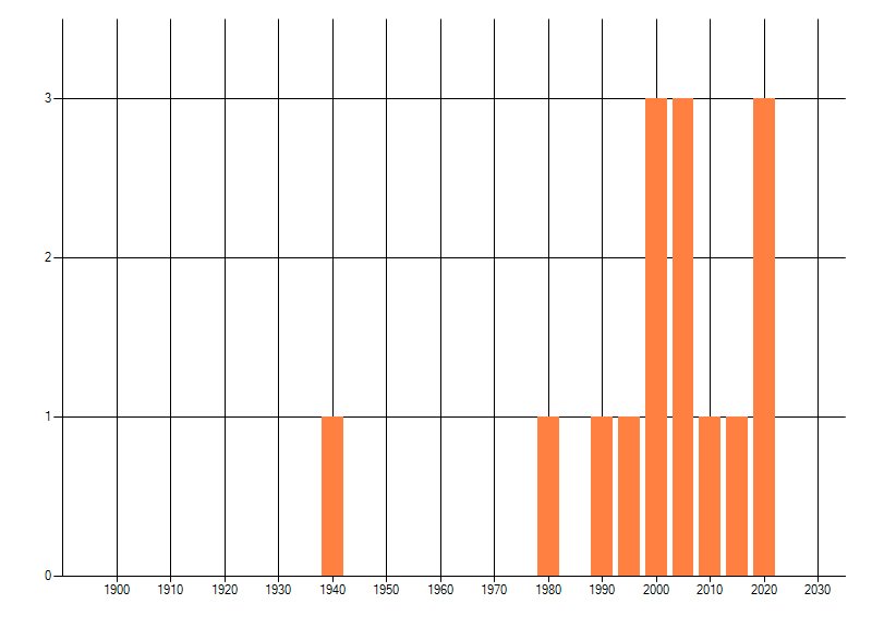 Het aantal atlasblokken (5x5 km) waarin de soort is gemeld binnen een periode van vijf jaar (vanaf 1980) of twintig jaar. Niet gecorrigeerd voor waarnemersinspanning en het aantal doorgegeven waarnemingen kan sterk variëren per periode, dus een trend in verspreiding kan hier niet direct uit worden afgelezen. Het opgegeven jaartal is het eerste jaar van de periode. Bron: gevalideerde waarnemingen uit de NDFF.
