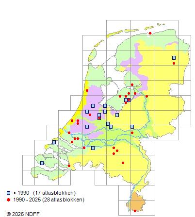Het aantal atlasblokken (5x5 km) waarin de soort is gemeld binnen een periode van vijf jaar (vanaf 1980) of twintig jaar. Niet gecorrigeerd voor waarnemersinspanning en het aantal doorgegeven waarnemingen kan sterk variëren per periode, dus een trend in verspreiding kan hier niet direct uit worden afgelezen. Het opgegeven jaartal is het eerste jaar van de periode. Bron: gevalideerde waarnemingen uit de NDFF.