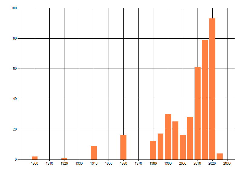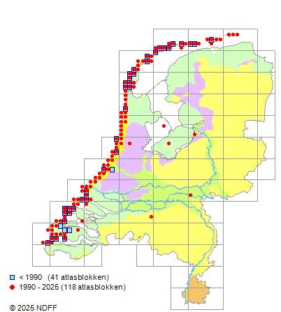 Het aantal atlasblokken (5x5 km) waarin de soort is gemeld binnen een periode van vijf jaar (vanaf 1980) of twintig jaar. Niet gecorrigeerd voor waarnemersinspanning en het aantal doorgegeven waarnemingen kan sterk variëren per periode, dus een trend in verspreiding kan hier niet direct uit worden afgelezen. Het opgegeven jaartal is het eerste jaar van de periode. Bron: gevalideerde waarnemingen uit de NDFF.