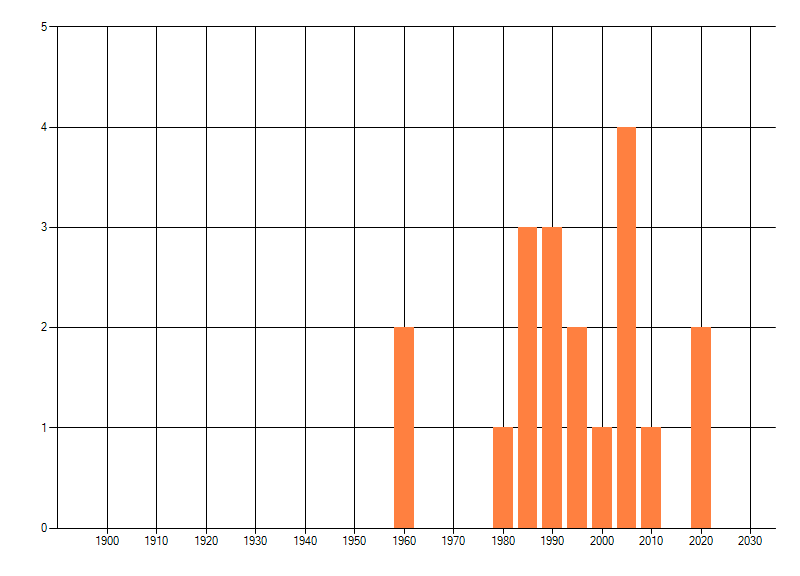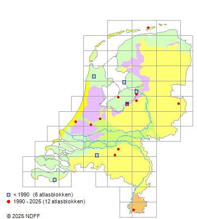 Het aantal atlasblokken (5x5 km) waarin de soort is gemeld binnen een periode van vijf jaar (vanaf 1980) of twintig jaar. Niet gecorrigeerd voor waarnemersinspanning en het aantal doorgegeven waarnemingen kan sterk variëren per periode, dus een trend in verspreiding kan hier niet direct uit worden afgelezen. Het opgegeven jaartal is het eerste jaar van de periode. Bron: gevalideerde waarnemingen uit de NDFF.