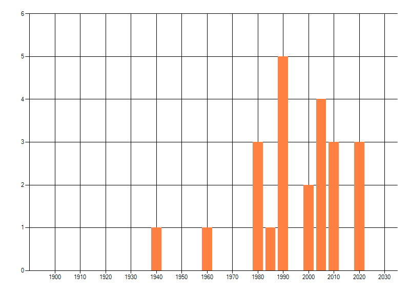 Het aantal atlasblokken (5x5 km) waarin de soort is gemeld binnen een periode van vijf jaar (vanaf 1980) of twintig jaar. Niet gecorrigeerd voor waarnemersinspanning en het aantal doorgegeven waarnemingen kan sterk variëren per periode, dus een trend in verspreiding kan hier niet direct uit worden afgelezen. Het opgegeven jaartal is het eerste jaar van de periode. Bron: gevalideerde waarnemingen uit de NDFF.