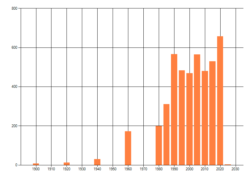 Het aantal atlasblokken (5x5 km) waarin de soort is gemeld binnen een periode van vijf jaar (vanaf 1980) of twintig jaar. Niet gecorrigeerd voor waarnemersinspanning en het aantal doorgegeven waarnemingen kan sterk variëren per periode, dus een trend in verspreiding kan hier niet direct uit worden afgelezen. Het opgegeven jaartal is het eerste jaar van de periode. Bron: gevalideerde waarnemingen uit de NDFF.