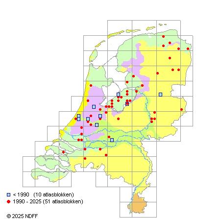 Het aantal atlasblokken (5x5 km) waarin de soort is gemeld binnen een periode van vijf jaar (vanaf 1980) of twintig jaar. Niet gecorrigeerd voor waarnemersinspanning en het aantal doorgegeven waarnemingen kan sterk variëren per periode, dus een trend in verspreiding kan hier niet direct uit worden afgelezen. Het opgegeven jaartal is het eerste jaar van de periode. Bron: gevalideerde waarnemingen uit de NDFF.