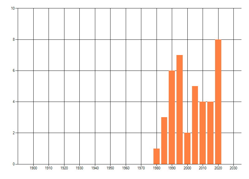 Het aantal atlasblokken (5x5 km) waarin de soort is gemeld binnen een periode van vijf jaar (vanaf 1980) of twintig jaar. Niet gecorrigeerd voor waarnemersinspanning en het aantal doorgegeven waarnemingen kan sterk variëren per periode, dus een trend in verspreiding kan hier niet direct uit worden afgelezen. Het opgegeven jaartal is het eerste jaar van de periode. Bron: gevalideerde waarnemingen uit de NDFF.