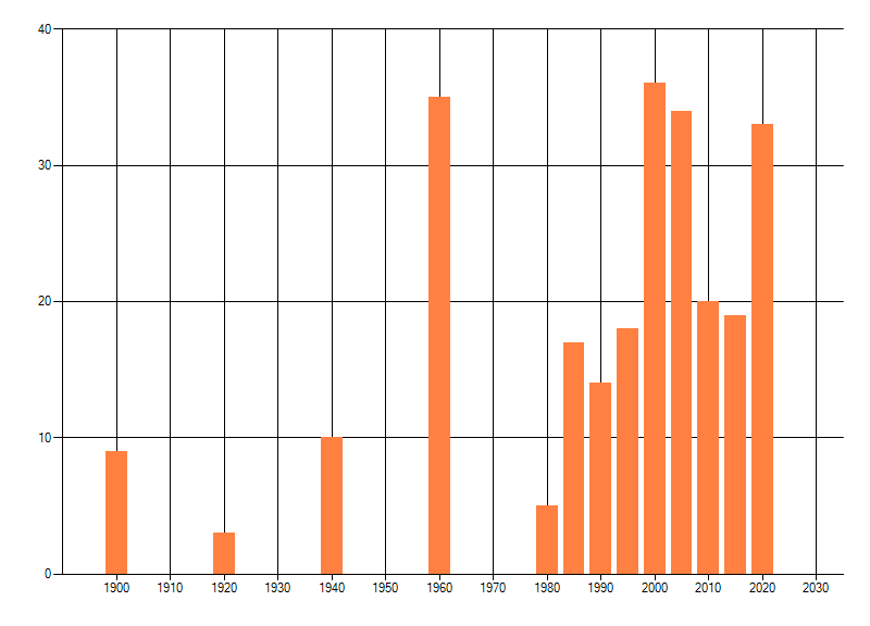 Het aantal atlasblokken (5x5 km) waarin de soort is gemeld binnen een periode van vijf jaar (vanaf 1980) of twintig jaar. Niet gecorrigeerd voor waarnemersinspanning en het aantal doorgegeven waarnemingen kan sterk variëren per periode, dus een trend in verspreiding kan hier niet direct uit worden afgelezen. Het opgegeven jaartal is het eerste jaar van de periode. Bron: gevalideerde waarnemingen uit de NDFF.