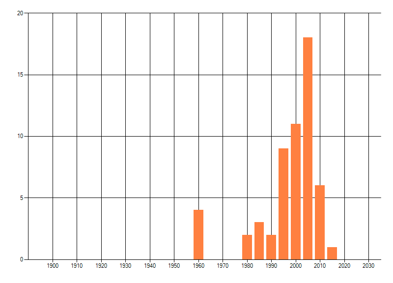 Het aantal atlasblokken (5x5 km) waarin de soort is gemeld binnen een periode van vijf jaar (vanaf 1980) of twintig jaar. Niet gecorrigeerd voor waarnemersinspanning en het aantal doorgegeven waarnemingen kan sterk variëren per periode, dus een trend in verspreiding kan hier niet direct uit worden afgelezen. Het opgegeven jaartal is het eerste jaar van de periode. Bron: gevalideerde waarnemingen uit de NDFF.
