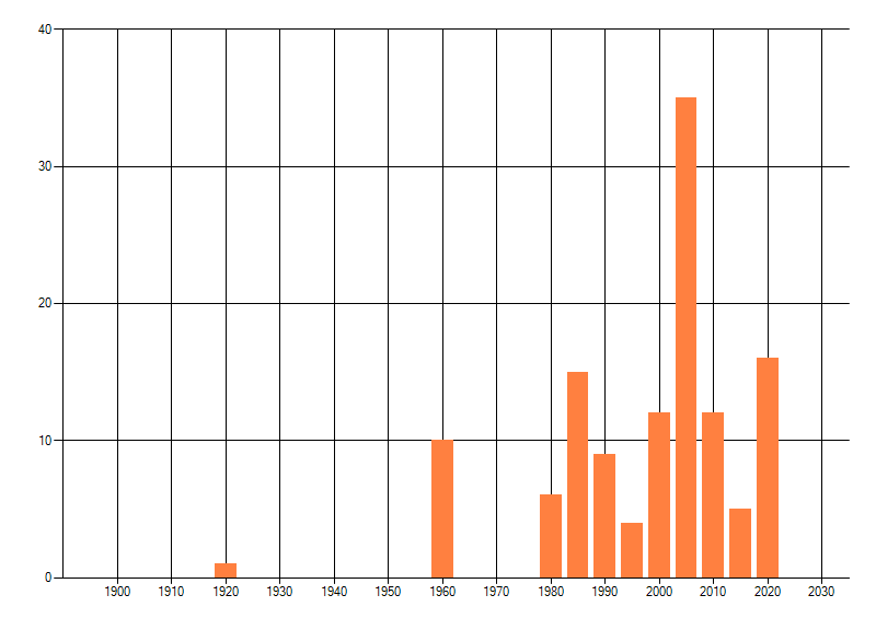 Het aantal atlasblokken (5x5 km) waarin de soort is gemeld binnen een periode van vijf jaar (vanaf 1980) of twintig jaar. Niet gecorrigeerd voor waarnemersinspanning en het aantal doorgegeven waarnemingen kan sterk variëren per periode, dus een trend in verspreiding kan hier niet direct uit worden afgelezen. Het opgegeven jaartal is het eerste jaar van de periode. Bron: gevalideerde waarnemingen uit de NDFF.
