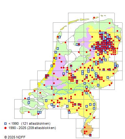 Het aantal atlasblokken (5x5 km) waarin de soort is gemeld binnen een periode van vijf jaar (vanaf 1980) of twintig jaar. Niet gecorrigeerd voor waarnemersinspanning en het aantal doorgegeven waarnemingen kan sterk variëren per periode, dus een trend in verspreiding kan hier niet direct uit worden afgelezen. Het opgegeven jaartal is het eerste jaar van de periode. Bron: gevalideerde waarnemingen uit de NDFF.