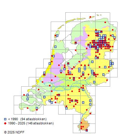 Het aantal atlasblokken (5x5 km) waarin de soort is gemeld binnen een periode van vijf jaar (vanaf 1980) of twintig jaar. Niet gecorrigeerd voor waarnemersinspanning en het aantal doorgegeven waarnemingen kan sterk variëren per periode, dus een trend in verspreiding kan hier niet direct uit worden afgelezen. Het opgegeven jaartal is het eerste jaar van de periode. Bron: gevalideerde waarnemingen uit de NDFF.