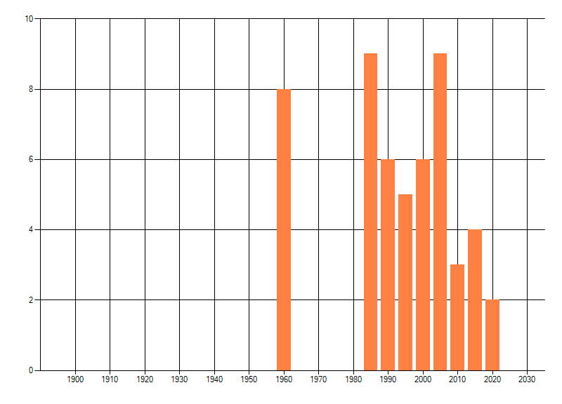 Het aantal atlasblokken (5x5 km) waarin de soort is gemeld binnen een periode van vijf jaar (vanaf 1980) of twintig jaar. Niet gecorrigeerd voor waarnemersinspanning en het aantal doorgegeven waarnemingen kan sterk variëren per periode, dus een trend in verspreiding kan hier niet direct uit worden afgelezen. Het opgegeven jaartal is het eerste jaar van de periode. Bron: gevalideerde waarnemingen uit de NDFF.