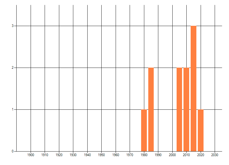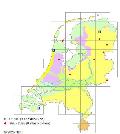 Het aantal atlasblokken (5x5 km) waarin de soort is gemeld binnen een periode van vijf jaar (vanaf 1980) of twintig jaar. Niet gecorrigeerd voor waarnemersinspanning en het aantal doorgegeven waarnemingen kan sterk variëren per periode, dus een trend in verspreiding kan hier niet direct uit worden afgelezen. Het opgegeven jaartal is het eerste jaar van de periode. Bron: gevalideerde waarnemingen uit de NDFF.
