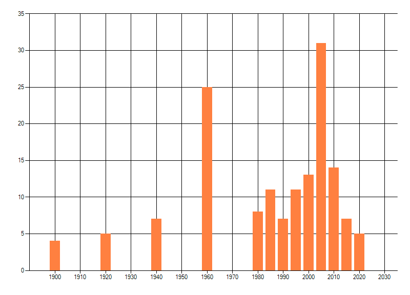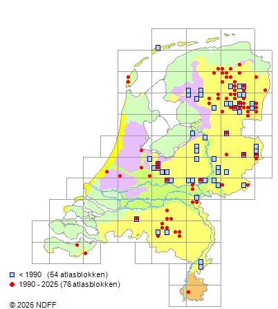 Het aantal atlasblokken (5x5 km) waarin de soort is gemeld binnen een periode van vijf jaar (vanaf 1980) of twintig jaar. Niet gecorrigeerd voor waarnemersinspanning en het aantal doorgegeven waarnemingen kan sterk variëren per periode, dus een trend in verspreiding kan hier niet direct uit worden afgelezen. Het opgegeven jaartal is het eerste jaar van de periode. Bron: gevalideerde waarnemingen uit de NDFF.