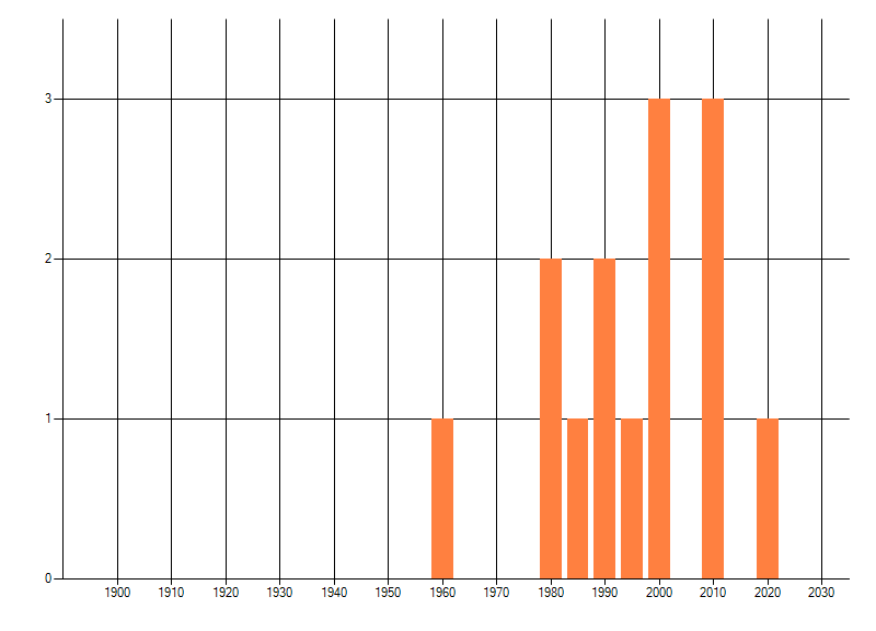 Het aantal atlasblokken (5x5 km) waarin de soort is gemeld binnen een periode van vijf jaar (vanaf 1980) of twintig jaar. Niet gecorrigeerd voor waarnemersinspanning en het aantal doorgegeven waarnemingen kan sterk variëren per periode, dus een trend in verspreiding kan hier niet direct uit worden afgelezen. Het opgegeven jaartal is het eerste jaar van de periode. Bron: gevalideerde waarnemingen uit de NDFF.