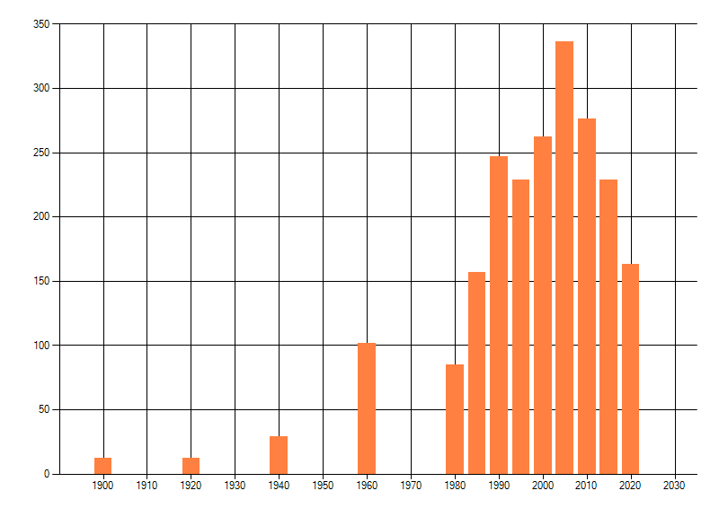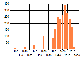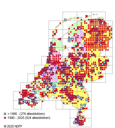 Het aantal atlasblokken (5x5 km) waarin de soort is gemeld binnen een periode van vijf jaar (vanaf 1980) of twintig jaar. Niet gecorrigeerd voor waarnemersinspanning en het aantal doorgegeven waarnemingen kan sterk variëren per periode, dus een trend in verspreiding kan hier niet direct uit worden afgelezen. Het opgegeven jaartal is het eerste jaar van de periode. Bron: gevalideerde waarnemingen uit de NDFF.