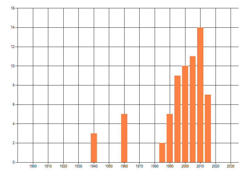 Het aantal atlasblokken (5x5 km) waarin de soort is gemeld binnen een periode van vijf jaar (vanaf 1980) of twintig jaar. Niet gecorrigeerd voor waarnemersinspanning en het aantal doorgegeven waarnemingen kan sterk variëren per periode, dus een trend in verspreiding kan hier niet direct uit worden afgelezen. Het opgegeven jaartal is het eerste jaar van de periode. Bron: gevalideerde waarnemingen uit de NDFF.