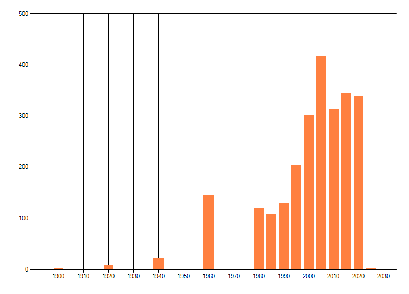 Het aantal atlasblokken (5x5 km) waarin de soort is gemeld binnen een periode van vijf jaar (vanaf 1980) of twintig jaar. Niet gecorrigeerd voor waarnemersinspanning en het aantal doorgegeven waarnemingen kan sterk variëren per periode, dus een trend in verspreiding kan hier niet direct uit worden afgelezen. Het opgegeven jaartal is het eerste jaar van de periode. Bron: gevalideerde waarnemingen uit de NDFF.