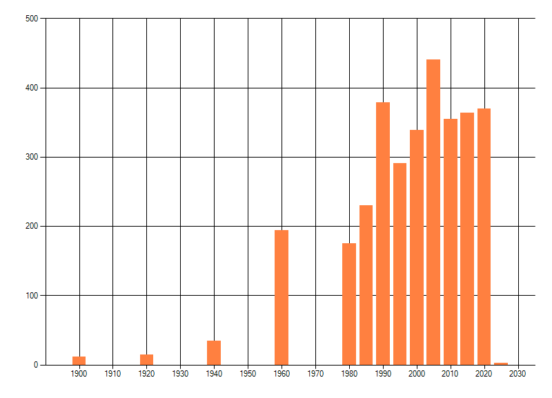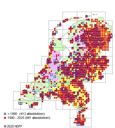Het aantal atlasblokken (5x5 km) waarin de soort is gemeld binnen een periode van vijf jaar (vanaf 1980) of twintig jaar. Niet gecorrigeerd voor waarnemersinspanning en het aantal doorgegeven waarnemingen kan sterk variëren per periode, dus een trend in verspreiding kan hier niet direct uit worden afgelezen. Het opgegeven jaartal is het eerste jaar van de periode. Bron: gevalideerde waarnemingen uit de NDFF.