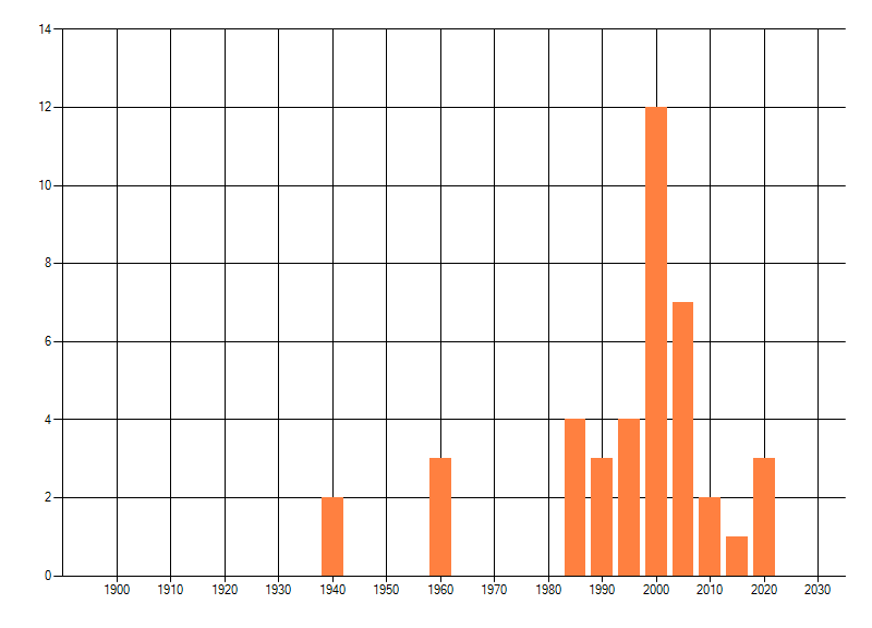 Het aantal atlasblokken (5x5 km) waarin de soort is gemeld binnen een periode van vijf jaar (vanaf 1980) of twintig jaar. Niet gecorrigeerd voor waarnemersinspanning en het aantal doorgegeven waarnemingen kan sterk variëren per periode, dus een trend in verspreiding kan hier niet direct uit worden afgelezen. Het opgegeven jaartal is het eerste jaar van de periode. Bron: gevalideerde waarnemingen uit de NDFF.