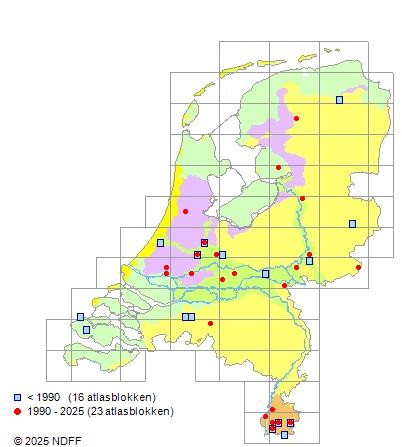 Het aantal atlasblokken (5x5 km) waarin de soort is gemeld binnen een periode van vijf jaar (vanaf 1980) of twintig jaar. Niet gecorrigeerd voor waarnemersinspanning en het aantal doorgegeven waarnemingen kan sterk variëren per periode, dus een trend in verspreiding kan hier niet direct uit worden afgelezen. Het opgegeven jaartal is het eerste jaar van de periode. Bron: gevalideerde waarnemingen uit de NDFF.