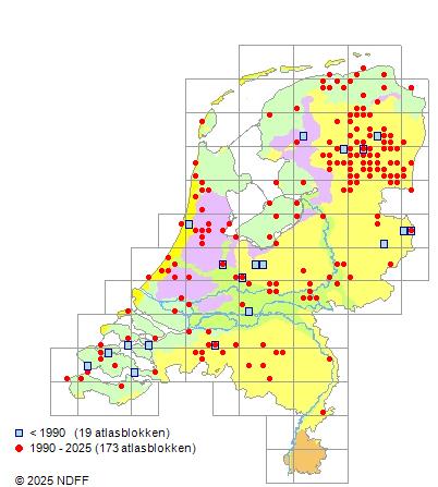 Het aantal atlasblokken (5x5 km) waarin de soort is gemeld binnen een periode van vijf jaar (vanaf 1980) of twintig jaar. Niet gecorrigeerd voor waarnemersinspanning en het aantal doorgegeven waarnemingen kan sterk variëren per periode, dus een trend in verspreiding kan hier niet direct uit worden afgelezen. Het opgegeven jaartal is het eerste jaar van de periode. Bron: gevalideerde waarnemingen uit de NDFF.