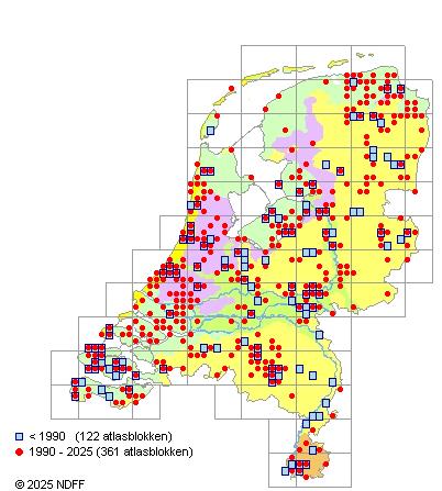 Het aantal atlasblokken (5x5 km) waarin de soort is gemeld binnen een periode van vijf jaar (vanaf 1980) of twintig jaar. Niet gecorrigeerd voor waarnemersinspanning en het aantal doorgegeven waarnemingen kan sterk variëren per periode, dus een trend in verspreiding kan hier niet direct uit worden afgelezen. Het opgegeven jaartal is het eerste jaar van de periode. Bron: gevalideerde waarnemingen uit de NDFF.