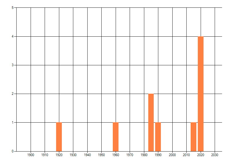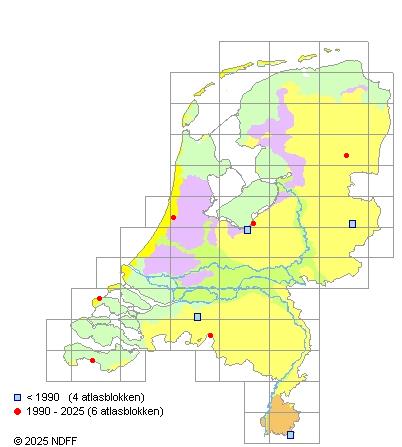 Het aantal atlasblokken (5x5 km) waarin de soort is gemeld binnen een periode van vijf jaar (vanaf 1980) of twintig jaar. Niet gecorrigeerd voor waarnemersinspanning en het aantal doorgegeven waarnemingen kan sterk variëren per periode, dus een trend in verspreiding kan hier niet direct uit worden afgelezen. Het opgegeven jaartal is het eerste jaar van de periode. Bron: gevalideerde waarnemingen uit de NDFF.