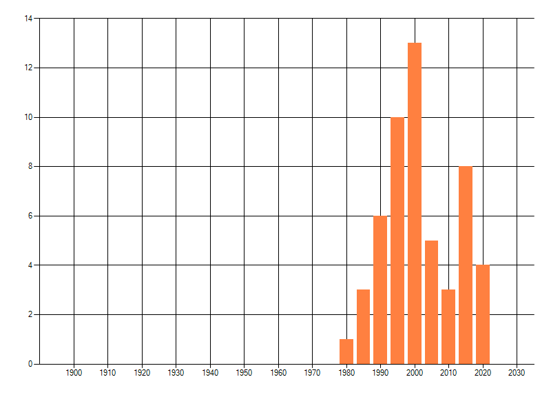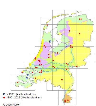 Het aantal atlasblokken (5x5 km) waarin de soort is gemeld binnen een periode van vijf jaar (vanaf 1980) of twintig jaar. Niet gecorrigeerd voor waarnemersinspanning en het aantal doorgegeven waarnemingen kan sterk variëren per periode, dus een trend in verspreiding kan hier niet direct uit worden afgelezen. Het opgegeven jaartal is het eerste jaar van de periode. Bron: gevalideerde waarnemingen uit de NDFF.